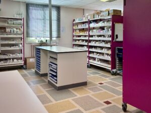 L’accompagnement a débuté par une journée de visite de l’établissement par les équipes de CAHPP. Au cours de celle-ci, les activités ainsi que les circuits du médicament et des DM ont été présentés. Les besoins, les projets à court et moyen terme et les nouveaux parcours de soins ont été exposés. Les difficultés de stockage — accentuées par le contexte inflationniste, l’allongement des délais de livraison, voire les ruptures d’approvisionnement — ont été soulevées, d’autant plus dans un espace limité à un peu plus de 100 m².