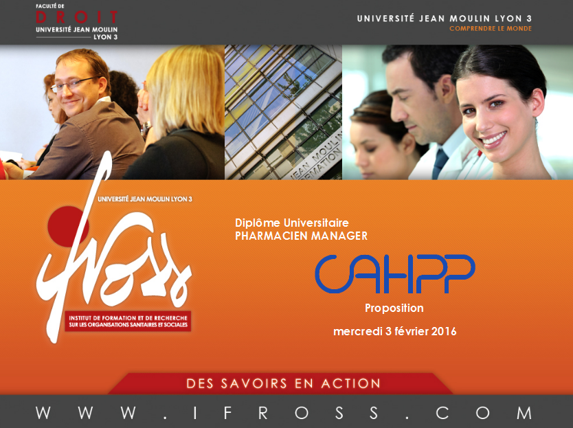 Création d’un nouveau diplôme universitaire de pharmacien manager, un partenariat de l’université Lyon III et la CAHPP. L’Institut de formation et de recherche sur les organisations sanitaires et sociales (IFROSS), Université Jean Moulin Lyon III et la CAHPP, lancent un nouveau diplômeuniversitaire qui débutera en octobre 2016.