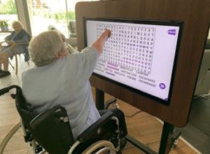 ActivTab est une grande tablette numérique de 110 cm de diamètre, montée sur roulettes, orientable pour être basculée à l’horizontal, inclinée ou à la verticale. Elle est interactive et incassable. Cette tablette géante est proposée dans les EHPAD principalement depuis 2020 mais il est possible de l’utiliser avec des personnes plus jeunes en pédiatrie par exemple. ActivTab s’utilise seul ou à plusieurs.