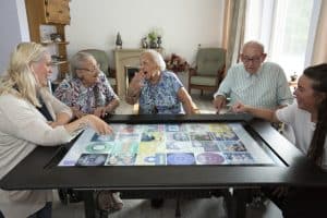 Ainsi, ActivTab propose des menus qui mettent l’accent sur la réminiscence en offrant des illustrations susceptibles d’inciter au partage de souvenirs. Les jeux proposés sollicitent la motricité fine en veillant à toujours adapter le niveau de l’exercice à la motricité des joueurs. Il est aussi envisageable de l’utiliser en famille lors d’une visite dans le centre afin d’impliquer enfants et petits-enfants à la session. Enfin muni d’un port USB, Activtab pourra être un support pour visionner des photos et des vidéos. Les activités sont destinées à éveiller ou apaiser le patient. Le personnel peut ainsi l’utiliser à différentes fins. ActivTab est un outil ludique qui permet de lutter contre l’apathie, de promouvoir la dextérité, de favoriser une récupération cognitive et l’échange entre les participants.
