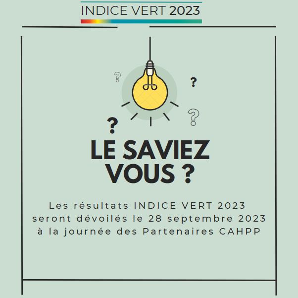 Les résultats INDICE VERT 2023 seront dévoilés le 28 septembre 2023 à la journée des Partenaires CAHPP à l’Espace St Martin (199 bis rue St Martin, 75003 Paris).