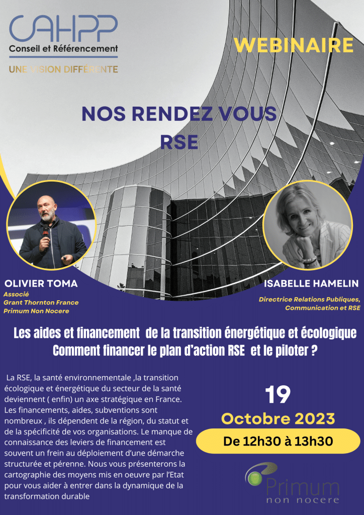 La RSE, la santé environnementale ,la transition écologique et énergétique du secteur de la santé deviennent ( enfin) un axe stratégique en France. Les financements, aides, subventions sont nombreux , ils dépendent de la région, du statut et de la spécificité de vos organisations. Le manque de connaissance des leviers de financement est souvent un frein au déploiement d’une démarche structurée et pérenne. Nous vous présenterons la cartographie des moyens mis en oeuvre par l’Etat pour vous aider à entrer dans la dynamique de la transformation durable