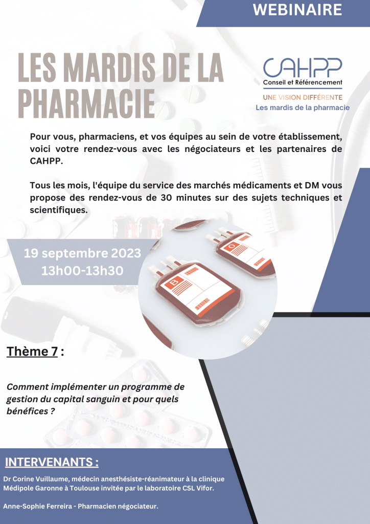 Pour vous, pharmaciens, et vos équipes au sein de votre établissement, voici votre rendez-vous avec les négociateurs et les partenaires de CAHPP. Tous les mois, l’équipe du service des marchés médicaments et DM vous propose des rendez-vous de 30 minutes sur des sujets techniques et scientifiques.