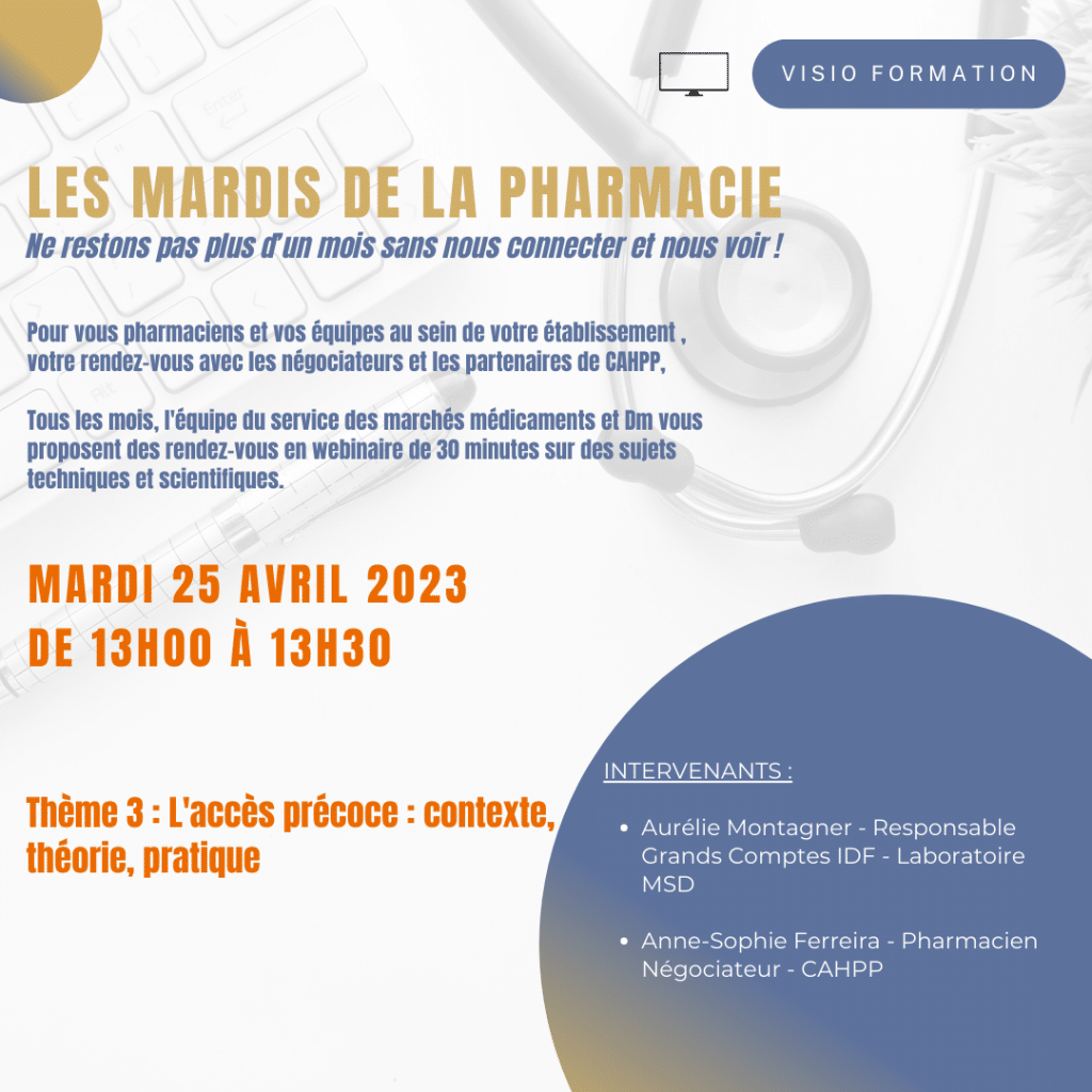 Pour vous pharmaciens et vos équipes au sein de votre établissement , votre rendez-vous avec les négociateurs et les partenaires de CAHPP, Tous les mois, l’équipe du service des marchés médicaments et Dm vous proposent des rendez-vous en webinaire de 30 minutes sur des sujets techniques et scientifique
